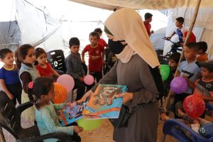 وأضافت محمد” أن أطفالنا محرومين من طفولتهم فنحن نحاول جعل الطفل يقضي وقتاً ممتعاً وهادفاً بالدرجة الأولى وأن يشعر الطفل بالحب و تخفيف من وطأة الحرب و التهجير التي تعرضوا لها.”